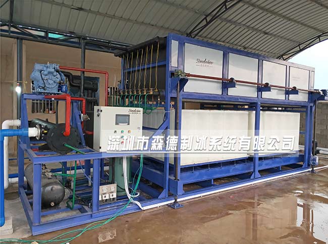 2.鹽水塊冰機,是間接的制冰方式,以鹽水作為熱交換的媒介。通過鹽水溫度下降,使冰桶內的水凍結成冰。脫冰方式需要行車將冰桶吊起,放入融冰池,塊冰表面融化后,才能把冰塊倒出,需要專業的人工操作。鹽水會污染土壤。